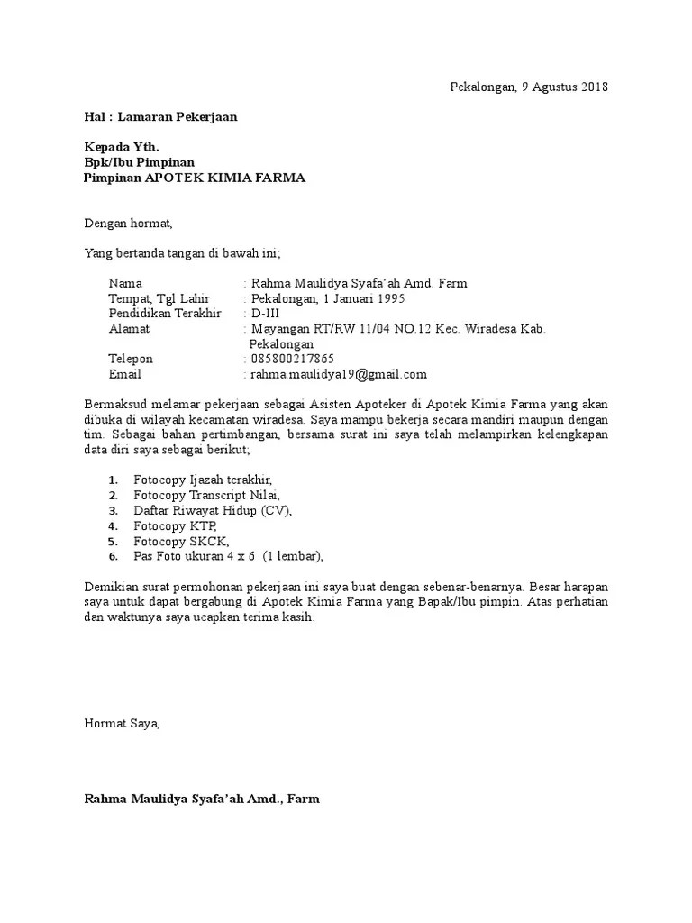 Contoh surat lamaran kerja di apotek k24, contoh cv farmasi, contoh surat. Contoh cv farmasi contoh chip. Berikut penjelasan masing masing bagiannya. Farmasi, lowongan contoh cv asisten apoteker, contoh surat lamaran kerja . Seperti melamar pekerjaan pada umumnya yang mengharuskan daftar riwayat hidup .